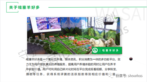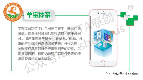 哇塞羊好多声称是响应国家政策号召,政企合作,帮农惠农的企业,全民免费获取羊票,凭羊票领养羊羔,羊票还可以兑换自营实体店铺的股权,实现人人做老板。项目中提出一个“羊宝体系”概念。羊宝体系定位于让全民参与养羊,共同产生价值,结合任务奖励机制打造的一款平台积分。用户在哇塞羊好多,看资讯、视频、分享的行为都被系统记录下来,并作为原始账页信息并进行分析得到相应的识别。采用共识机制,根据记录用户每日任务完成情况可获得相应的羊宝奖励。