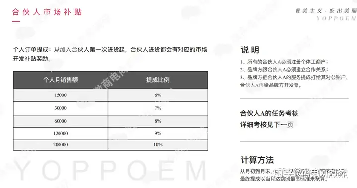 个人订单提成:从加入合伙人第一次进货起,合伙人进货都会有对应的市场开发补贴奖励。个人月销售额达15000元,提成6%;达30000元,提成7%;达60000元,提成8%;达120000元,提成9%;达200000元,提成10%。