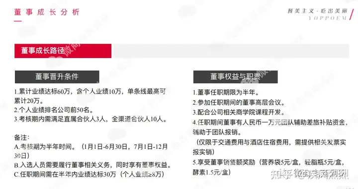 董事所属权益:参加任职期间的董事高层会议;配合公司相关商学院课程开发;任职期间董事有1万元的团队辅助差旅补贴资⾦,辅助于团队报销。(仅限于交通费用与酒店住宿费用,需提供相关发票实报实销);享受董事销售额奖励(营养袋5元/盒,轻脂瓶5元/盒,
