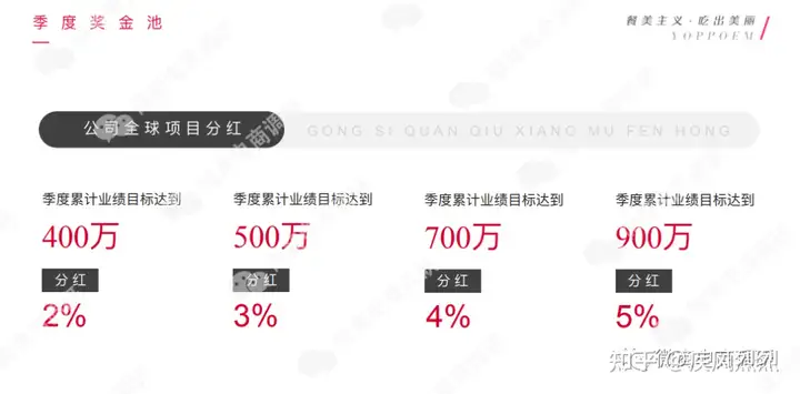 3. 公司全球项目分红:季度累计业绩目标达到400万,分红2%;达到500万,分红3%;达到700万,分红4%;达到900万,分红5%。
