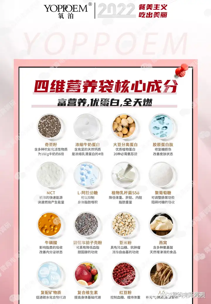 氧泊旗下的另外一款产品——氧泊四维营养袋同样值得关注,在经销商所提供的宣传材料中,该款产品所含有圆苞车前子壳粉、薏米粉、红豆粉等成分被包装出具有降血脂、降血糖、抗肿瘤等功效,同样,这样的宣传依然可能会误导消费者以为该款产品本身也具有这些功效。