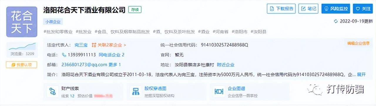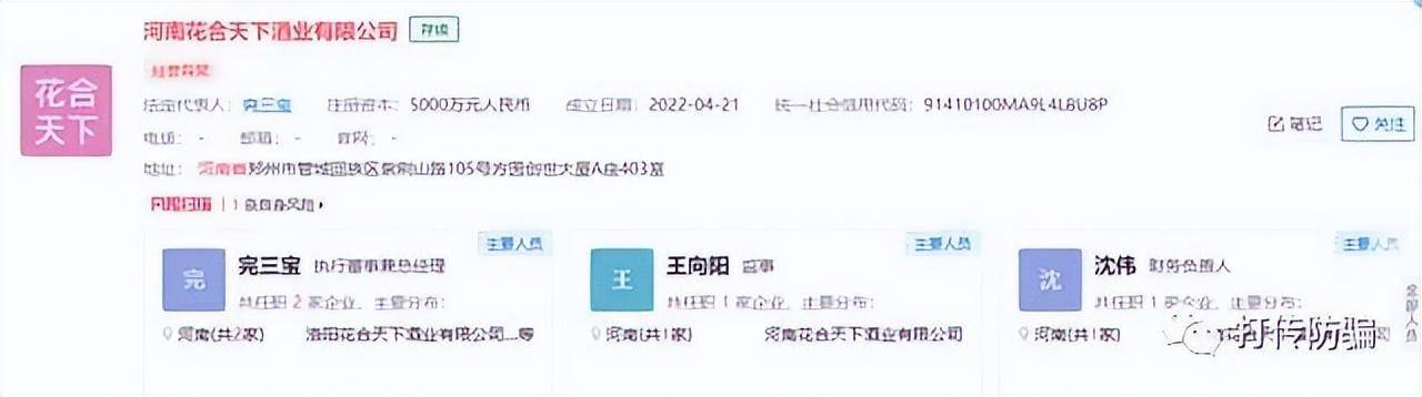 那么“花合天下”是做什么的呢?“花合天下”是河南花合天下酒业有限公司运营的项目。根据企查查显示,河南花合天下酒业有限公司,成立于2022年4月21日,注册资本5000万人民币,实缴资本为0,法定代表人为完三宝,持股比例100%。目前经营异常。完三宝名下还有洛阳花合天下酒业有限公司,洛阳花合天下酒业有限公司成立于2011年3月18日,注册资本5000万人民币,实缴资本为10万。