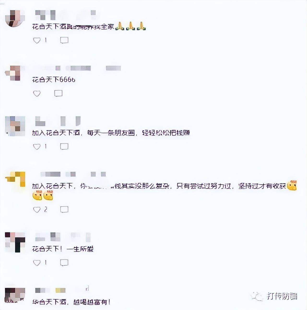 还有那些在花合天下视频号下面评论的人,一看就是托儿。说什么花合天下真的可以养她全家,说加入花合天下酒,越喝越富有!在我们看来,就是一句句昧着良心说的话。