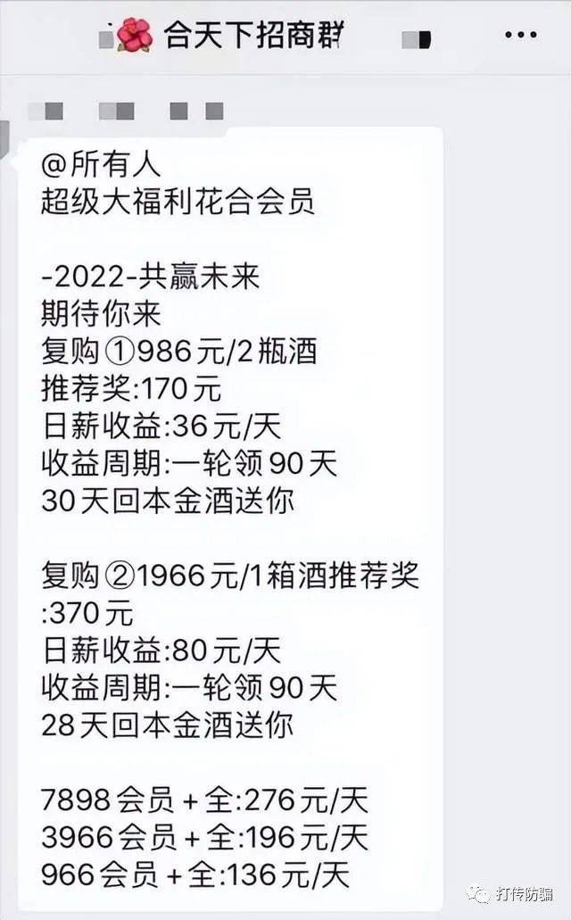除此之外,他每天还在群里大力拉人,吹嘘“你把花合当家,花合养你全家”。还推出超级大福利花合会员:复购①986元/2瓶酒,推荐奖:170元,日薪收益:36元/天,收益周期:一轮领90天,30天回本金酒送你。复购②1966元/1箱酒推荐奖:370元;日薪收益:80元/天;收益周期:一轮领90天,28天回本金酒送你。