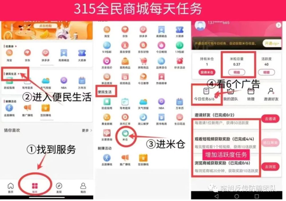 然而卷轴模式作为资金盘的变种,他不同于以往资金盘拆东墙补西墙的激进模式,不拆东墙,而是大家一起把这个盘做起来,越来越多的用户涌入,积分才更值钱。殊不知,这里面的风险却是巨大的,就像“全民商城”这样的卷轴模式,通过投入米粒来兑换任务包(卷轴),通过不断的获得任务包(复投)来获得额外的奖励,参与者就需要不断拉新人进去维护这个局面,一旦有人跳出来,此盘必崩。