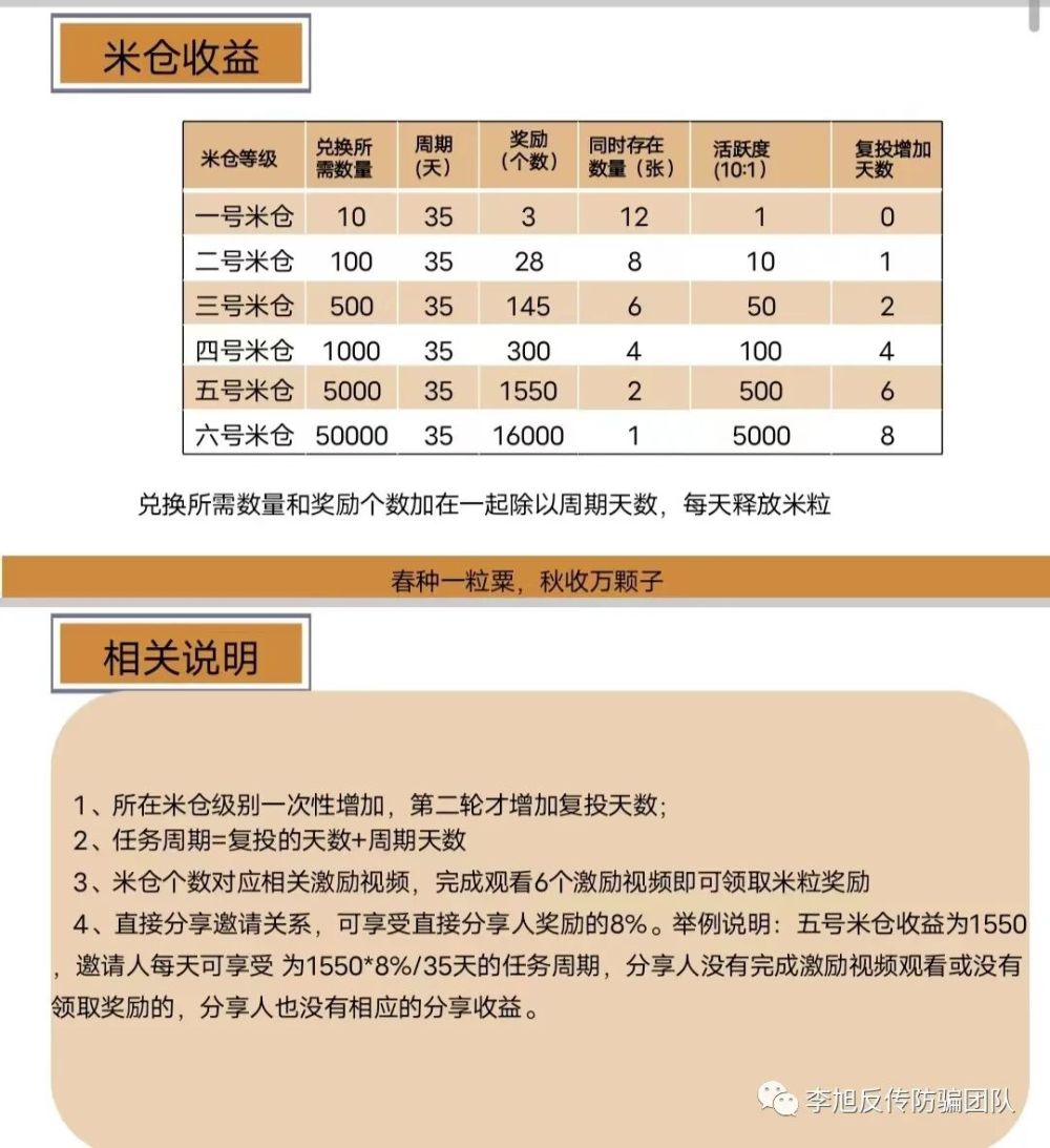 拿“万民商城”举例:加入后便送一个一号米仓(即卷轴),10个米粒兑换一个一号米仓,任务周期35天,通过该任务(兑换所需数量和奖励个数加在一起除以周期天数)每天获得0.37个米粒,35天后,该任务可获得12.95个米粒。而这12.95个米粒就可以继续复投,加上发展下线获得额外的推广收益,以此达到0撸获得高收益的目的。