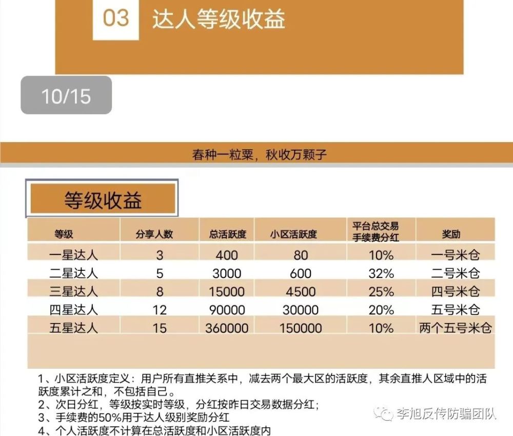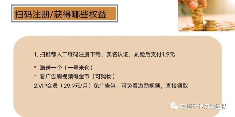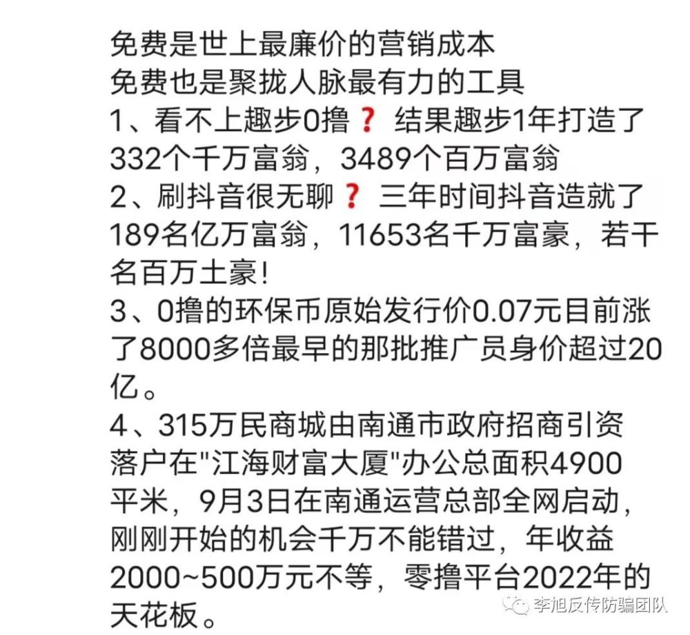 这种看似不需要自己投资,不存在高额入会门槛的经营活动,不过是把大量因入门费而拒绝参与其中的人拉进门,“广撒网”扩大其受众面,然后通过所谓的“积分”、赚取交易手续费,把以往传销的“前置”入门费转移到“中期”交易或者“后置”收割,以达到割韭菜的目的。李旭反传防骗团队提醒广大网友,对于各类投资项目,无论投资大小,广大网友都应该认清其本质,切勿抱着贪图小便宜的心理参与其中。