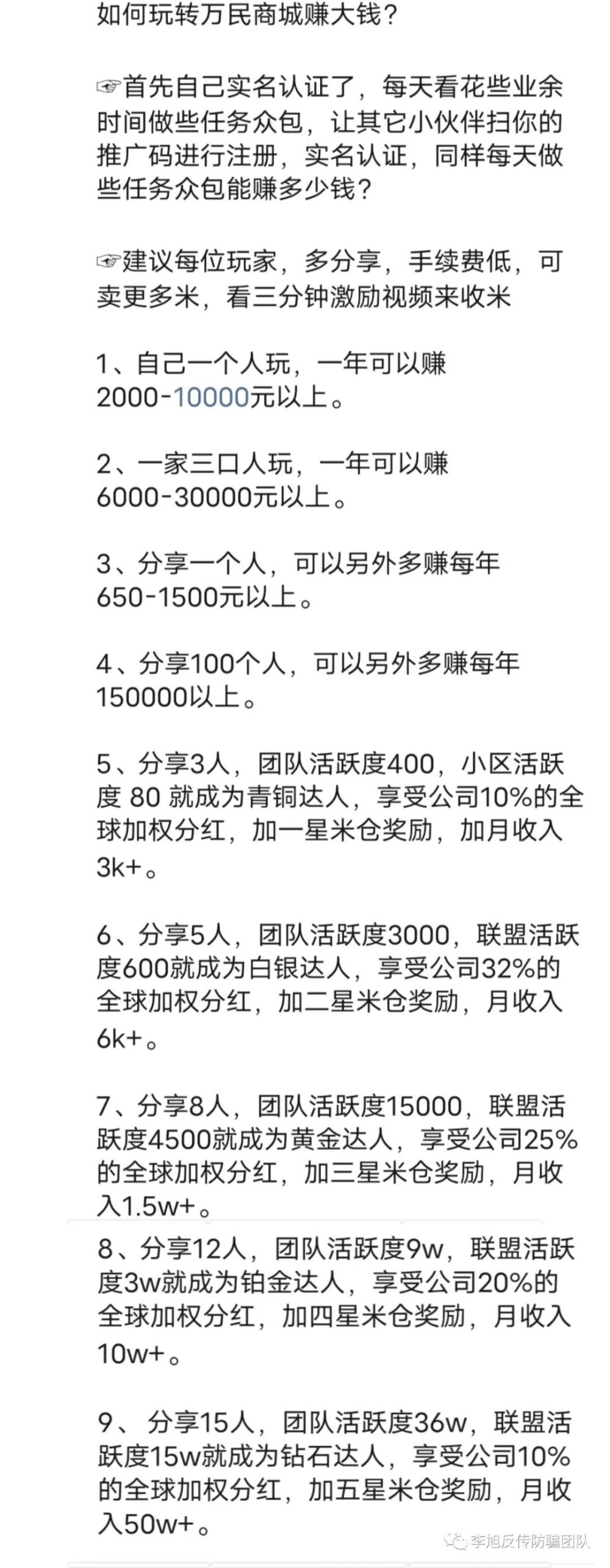 为了使参与者更直观了解“万民商城”的收益模式,该平台对每个等级的推荐达人收益进行了计算,如按照其要求的方式进行,分享15人以上,甚至可以月收入高达50w+。如果真能实现这样的收益,简直连世界首富都要甘拜下风了。