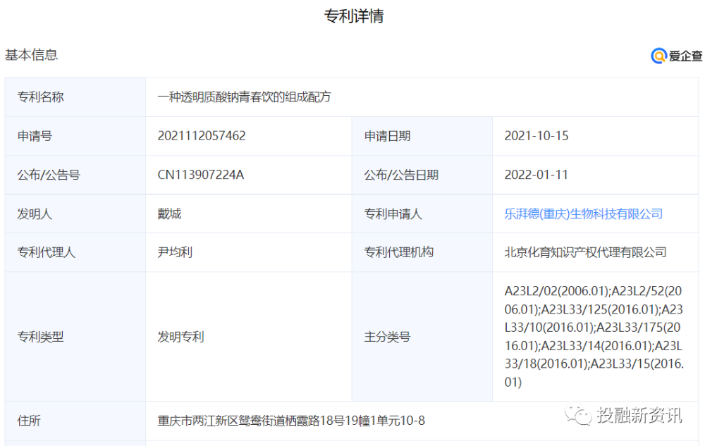 据爱企查显示,“透明质酸纳青春饮”发明专利的申请公司是乐湃德(重庆)生物科技有限公司。