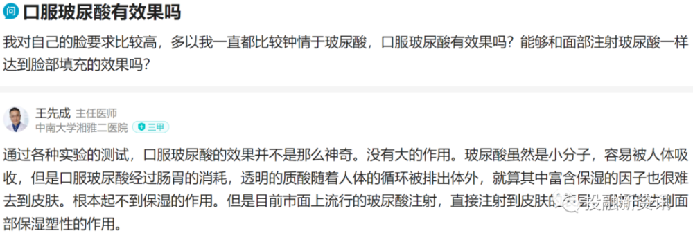中南大学湘雅二医院主任医师王先成曾表示:通过各种实验的测试,口服玻尿酸的效果并不是那么神奇。