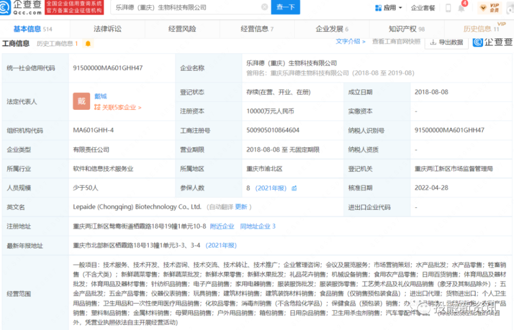 据企查查显示,乐湃德(重庆)生物科技有限公司成立于2018年8月8日,位于重庆市北部新区栖霞路18号13幢1单元3-3、3-4,注册资本1亿,实缴不详,法人代表戴城任执行董事,为公司实际控制人。