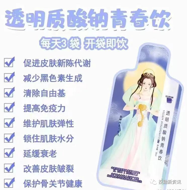 据宣传资料显示,康尔快销运营的款“透明质酸青春饮”是一款口服玻尿酸,不用打针、不用涂抹、不用开刀做手术,每天喝一袋,就能达到美容等多种效果。
