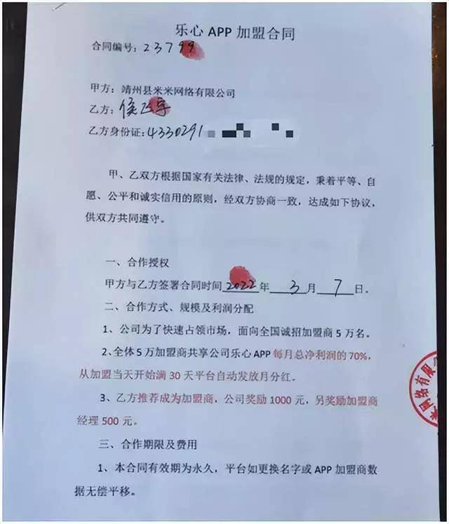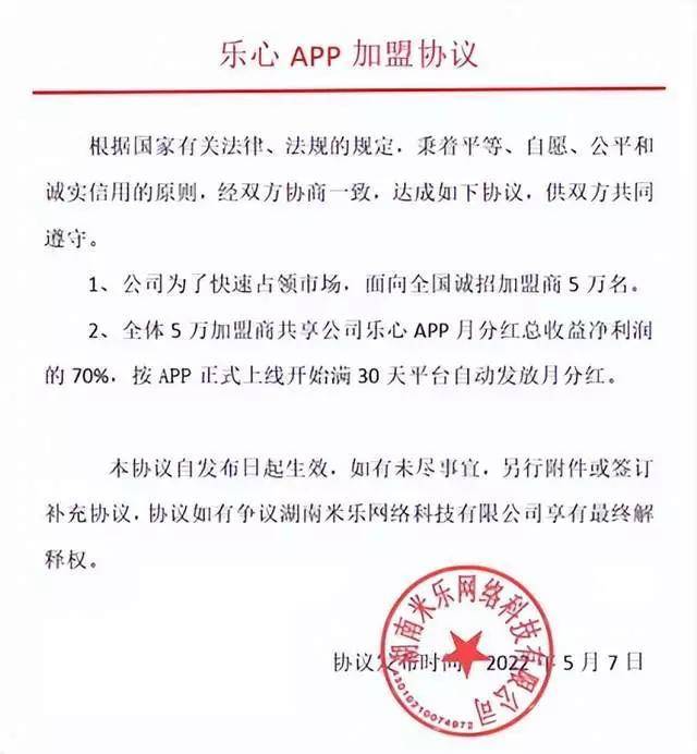 湖南米乐公司的前身“靖州县米米网络有限公司”成立于2018年,自营的“米可商城”也未走出当地县城。在引进“乐心APP”这一项目后, 2022年3月1日至4月29日两个月时间,米米公司以2000元(公司包赔)成为乐心股东加盟商(起初称“星钻会员”,后改名“股东加盟商”)作为诱饵,并以静态可拿公司每月总收益的1%(最低4200元);动态直推一名股东,可拿50%的推荐奖,即奖励1000元;间推一名股东,奖励500元;直推10名股东,可拿团队的2%(即见点奖40元/位)。入股30天后即可拿永久分红(5万股东共享公司盈利的70%)作为招募股东加盟商的加盟方式及奖励制度。