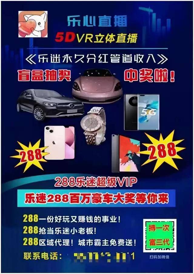 8月22日至10月30日止,米乐公司又开始以“玛莎拉蒂”等豪车作奖品、总奖池200万元等作诱饵,开启了他们的最新一轮收割——招募首批“超级主播”:交5888元成为超级主播,享受全新直播平台首批带货红利赠送万元货物!海量用户流量支持。“超级主播”福利有四项:即“赠送价值1万元的带货产品,公司根据主播艺人量身搜寻的供应链带货产品(所有收益均归主播所得);赠送价值8万元的流量扶持,推送人数10万人次,平台根据主播申请均分为12个自然月推送流量;成为超级主播,共享平台总收益的百分之10收益;成为超级主播,直播间流水达到百万即可成为公司原始股份股东,股份占比百分之0.01,此股份享受公司所有产品链股份分红收益!”。“平台量身订制,打造大网红!直推一个超级主播奖励588并永久拿主播收益的1%!超级大管道!”“推广的主播月收入100万推广一个,每个月躺赚1万!推广10个每个月躺赚10万!推广的主播月收入1000万!推广一个,每个月躺赚10万!推广10个,每个月躺赚100万推广的主播月收入一个亿推广一个,每个月躺赚100万!推广10个每个月躺赚1000万!乐心大舞台!有梦你就来!”不知道这一轮收割,又会有多少不明白的“韭菜”上当受骗。
