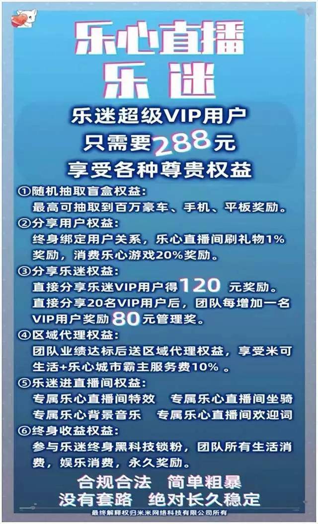 “288元小投资,大生意!乐心大舞台,有梦你就来!”从2022年5月开始,靖州米米公司采用的基础会员推广模式他们自己都觉得十分简单粗暴:该公司规定,在“乐心”日常的“乐迷”会员(又称“乐迷超级VIP用户”)奖励政策中号称,“288元(最初只需交168元)为乐迷红利期,最高可抽取到“百万豪车”(后一会员表示仅一位“峰少”抽中一辆白色别克英朗轿车,价值11.99-12.59万)、手机、平板奖励。直推一个人拿120元(现在新制度是15000乐心币),直推满20个人后,可拿团队管理奖(见点奖)80元/位(也就是20000乐心币),平级拦截(团队里有一个人拉满20个人,你就不能拿他下面的团队管理奖)。直推团队消费1%,游戏20%!终身管道收益!锁定一万人,每人每天给你赚一块,一天躺赚一万块!绝对简单粗暴!”“只需要288元激活乐迷,推广业绩达到相应的区域就可以当区域地主!享受区域内对接的实体店盈利的10%分红!……这里面不仅有门槛费288元,还需要不断直推拉人头,更包含有团队计酬奖,非常符合传销的三大基本特征。