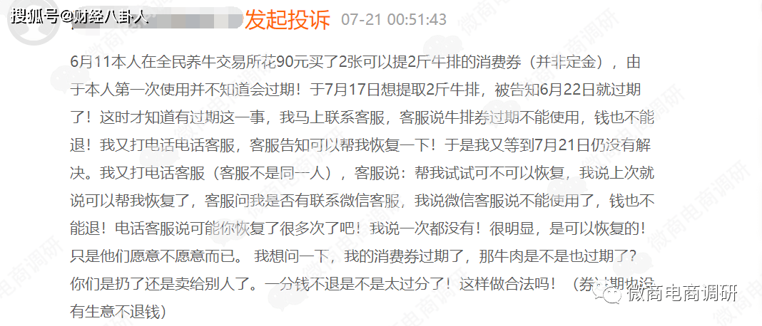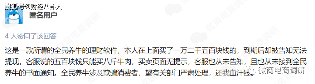 说到投诉,在知乎平台上,也有匿名用户反馈:“本人在上面买了一万二千五百块钱的,到期后却被告知无法提现,客服说的五百块钱只能买八斤牛肉,买卖页面无提示,客服也从未告知,我也从未接到全民养牛的书面通知。全民养牛涉嫌欺骗消费者,望有关部门严肃处理,还我血汗钱。”