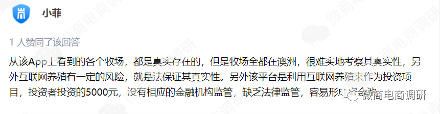 早些年间,菲凡烽火台也曾在知乎平台上回答过网友关于全民养牛的疑问:“该平台利用互联网养殖来作为投资项目,投资者投资的钱,没有相应的金融机构监管,缺乏法律监管,容易形成资金池。”