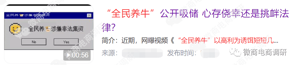 不久前,网上也出现了关于曝光全民养牛项目存在法律风险的短视频,并引发了不少网友进行转载。