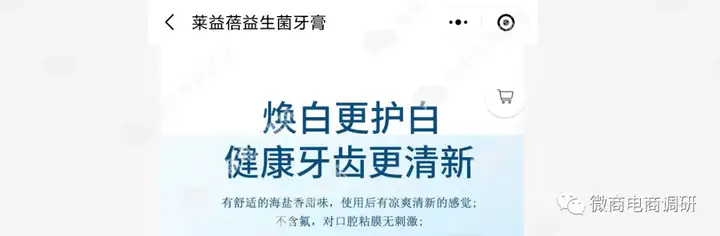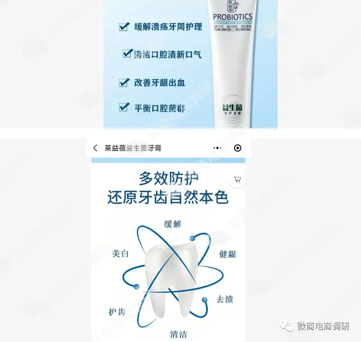 在莱益蓓旗下的微信小程序的包装下,该产品具有了“缓解溃疡、平衡口腔菌群、改善牙龈出血、美白”等多重功效。