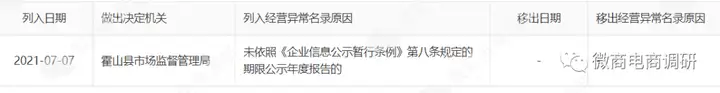 2020年11月,杭州莱益蓓公司投资成立了子公司六安市莱益蓓食品有限公司,不过在2021年7月,这家公司(已注销)就因未依照《企业信息公示暂行条例》第八条规定的期限公示年度报告,而被霍山县市场监督管理局列入到企业经营异常名录。