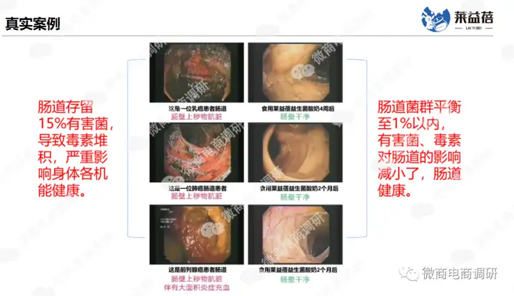 但归根结底,莱益蓓酸奶只是普通食品,并非保健食品或药品,不具备任何保健食品所具有的功能以及药品所具有的治疗功效。然而,有关宣传材料却晒出了案例来证明莱益蓓酸奶的神奇功效,有关截图展示,肠道存留有害菌过多,会严重影响身体各机能的健康,乳癌患者、肺癌患者,还有肠壁伴有大面积炎症充血的前列腺癌患者在食用莱益蓓酸奶一段时间后,肠壁都干净了。
