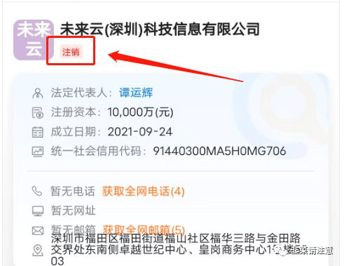 2021年9月份成立的“未来云(深圳)科技信息有限公司”的法人是谭运辉,目前已注销。