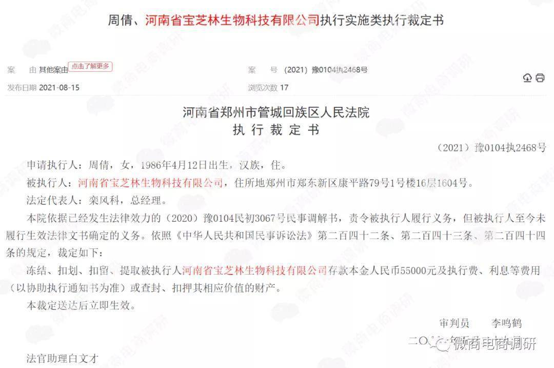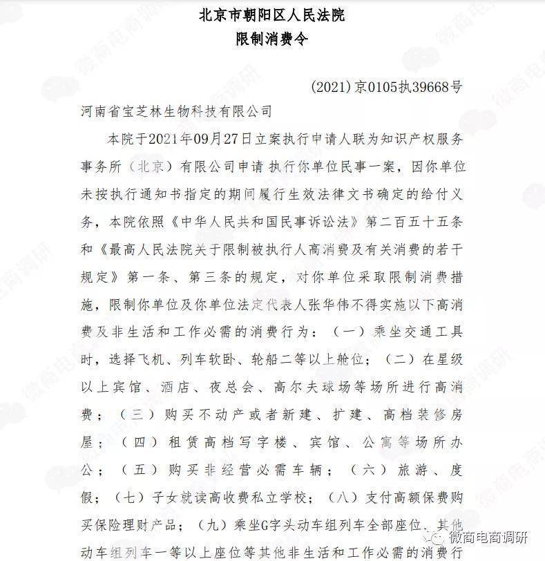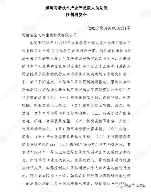 2021年5月,河南省宝芝林生物科技有限公司因无法联系而被郑州市市场监督管理局自贸区服务中心列入了经营异常名录,一个月后被移出。此外,河南宝芝林生物公司在2021年还牵扯到了三个民事纠纷,分别是买卖合同纠纷、债务转移合同纠纷和劳动合同纠纷,并且这家公司的法定代表人张华伟、杨友林分别于2021年9月27日和2021年11月12日被法院列为了失信被执行人,被限制了高消费,具体内容见下文截图。