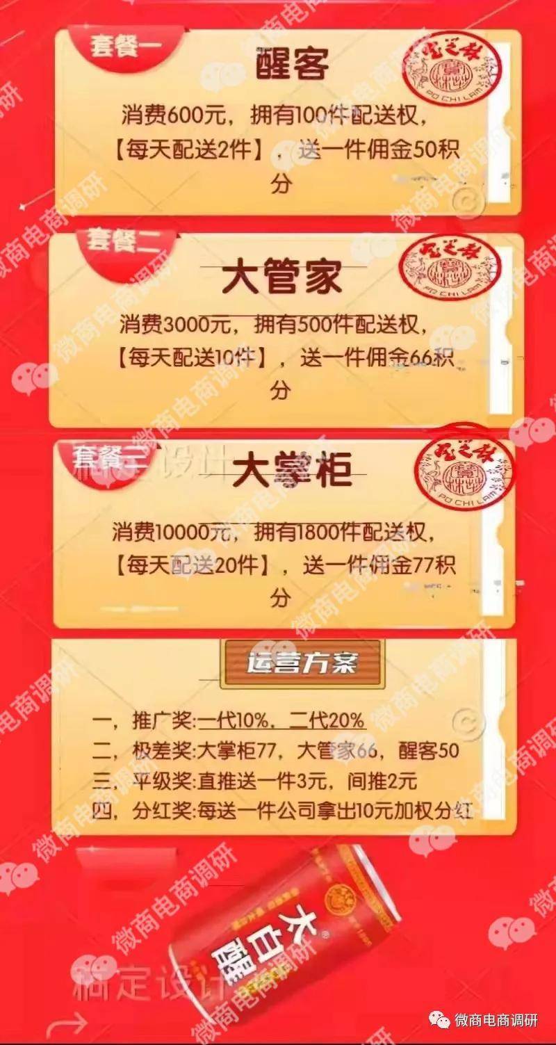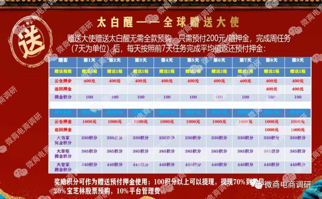 一次性购买3000元10箱太白醒,可获得大当家资格,并有500箱赠送券,每赠送1箱太白醒获得劳务佣金66积分,每天可领10箱赠送任务,同时可获级差奖和平级奖。