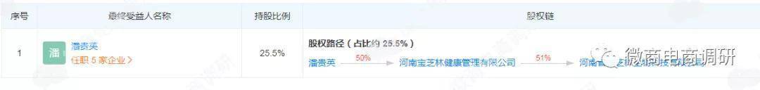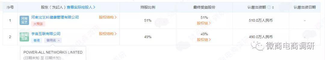 工商信息显示,河南省宝芝林生物科技有限公司成立于2017年3月14日,注册资本为1000万人民币,实缴资本0元,法定代表人为杨友林,经营范围包括一般项目:生物技术开发;为老年人提供生活照料、老年产品用品、老年健康服务、老年体育健身、老年文化娱乐、老年旅游服务;为老年人提供家政、日间照料、医疗护理、精神慰藉服务;为居家老年人提供助餐、助浴、助急、助医定制服务等。该公司董事长为杨振东,主要股东为河南宝芝林健康管理有限公司,占股51%,宇宙互联有限公司(注册于中国香港,曾用名POWER-ALL NETWORKS LIMITED),占股49%。最终受益人潘贵英通过河南宝芝林健康管理有限公司持有河南省宝芝林生物科技有限公司50%的股份。