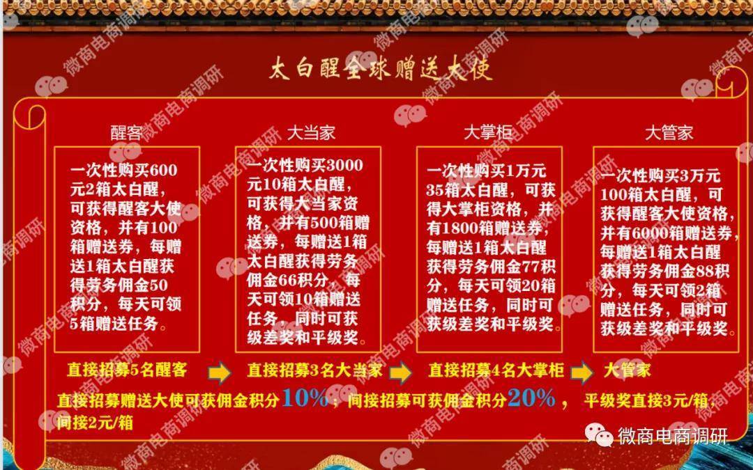 一次性购买3万元100箱太白醒,可获得醒客大使资格,并有6000箱赠送券,每赠送1箱太白醒获得劳务佣金88积 分,每天可领2箱赠送任务,同时可获级差奖和平级奖。