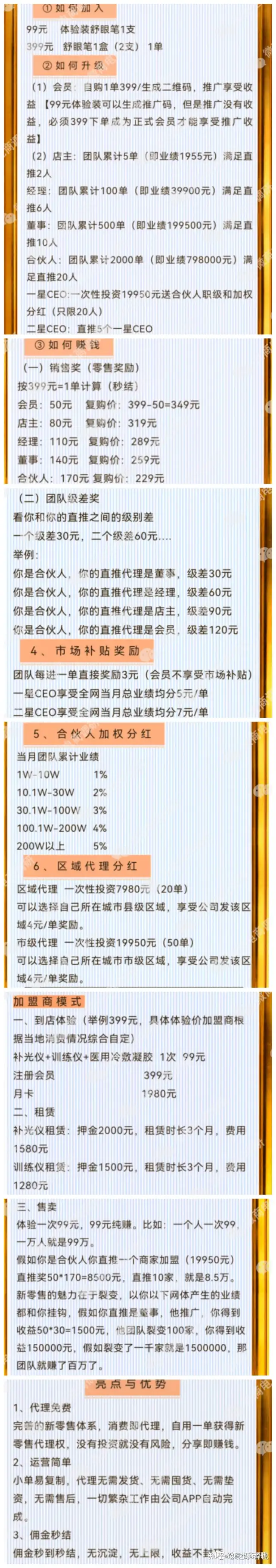 文章的最后,我们再来关注一下晶睛美眸现行的奖金制度该如何解读,据公众号“晶睛美眸新零售有限公司”介绍,晶睛美眸公司走的是新零售社交电商模式+实体新店模式,真正做到了小投资、大事业,0风险、0压力、0囤货、0积压、0押金、0库存的7个0的创业模式(实际上,只有6个0)。399元买一盒(内含二支产品),同时还获得了晶睛美眸新零售的终身代理权,你分享得越多、卖出去的产品越多,你的代理级别就越高,你的拿货价格就越低,你的利润空间也就越大。通过分享积累,打造出自己的团队,建立了自己的财富管道,晶睛美眸新零售后续推出的每一款新品,你都无需二次投资,就能获得被动收益,晶睛美眸新零售模式将会为你带来多重管道收益。