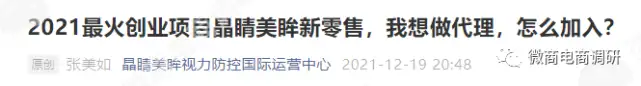 此外,该公众号的发布者“张美如”还将“2021最火创业项目”这个称谓贴到了晶睛美眸新零售的身上。