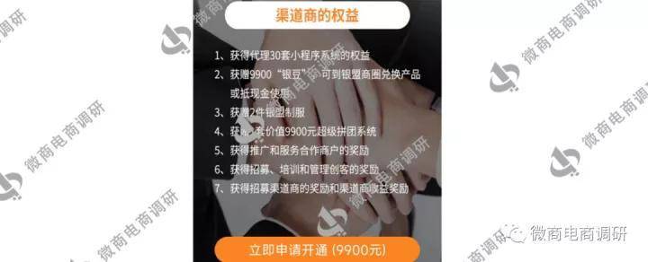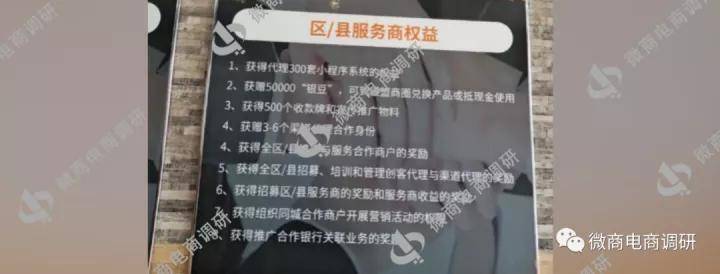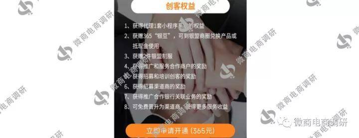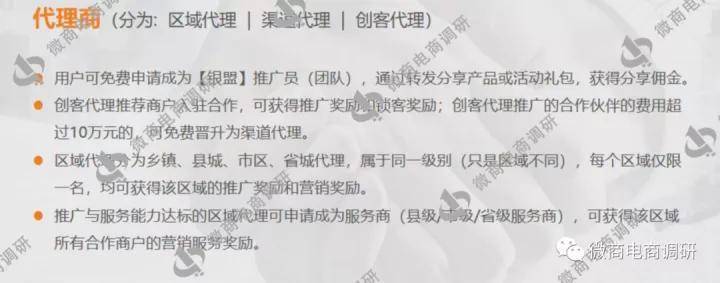 用户可免费申请成为银盟推广员,通过转发分享产品或活动礼包,获得分享佣金。创客代理推荐商户入驻合作,可获得推广奖励和锁客奖励;创客代理推广的合作伙伴的费用超过10万元的,可免费晋升为渠道代理。区域代理分为乡镇、县城、市区、省城代理,属于同一级别(只是区域不同),每个区域仅限一名,均可获得该区域的推广奖励和营销奖励。推广与服务能力达标的区域代理可申请成为服务商(县级/市级/省级服务商),可获得该区域所有合作商户的营销服务奖励。