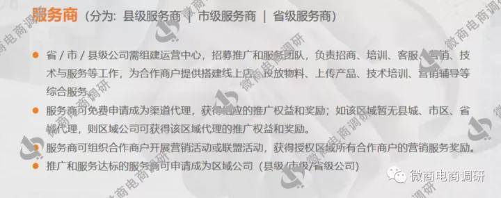省/市/县级公司需组建运营中心,招募推广和服务团队,负责招商、培训、客服、营销、技术与服务等工作,为合作商户提供搭建线上店、投放物料、上传产品、技术培训、营销辅导等综合服务。服务商可免费申请成为渠道代理,获得相应的推广权益和奖励;如该区域暂无县城、市区、省城代理,则区域公司可获得该区域代理的推广权益和奖励。服务商可组织合作商户开展营销活动或联盟活动,获得授权区域所有合作商户的营销服务奖励。推广和服务达标的服务商可申请成为区域公司(县级/市级/省级公司)。