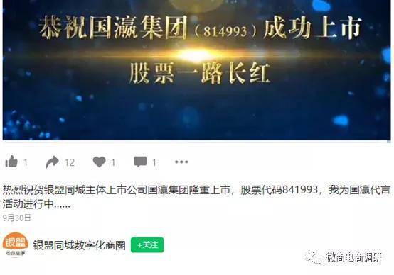不久前,银盟方面还发布消息称:银盟同城主体上市公司国瀛集团完成上市,股票代码814993(下图中,银盟的相关账号竟然还把814993打成了841993)。