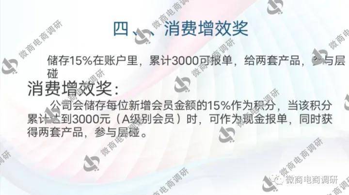 消费增效奖:公司会储存团队中每位新增代理金额15%作为积分,放积分累计达到3000元(普通代理)时,可作为现金报单,同时获得两套产品,参与层碰。