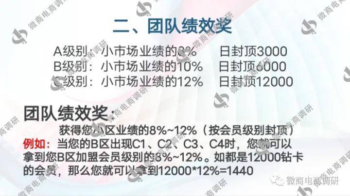 团队绩效奖:成为代理后,可获得团队小市场(除去团队中业绩最大的市场,剩下的为小市场)业绩8%~12%的团队绩效奖。普通代理商可获得团队小市场业绩8%的团队绩效奖,日封顶3000元;中级代理商可获得团队小市场业绩10%的团队绩效奖,日封顶6000元;高级代理商可获得团队小市场业绩12%的团队绩效奖,日封顶12000元;
