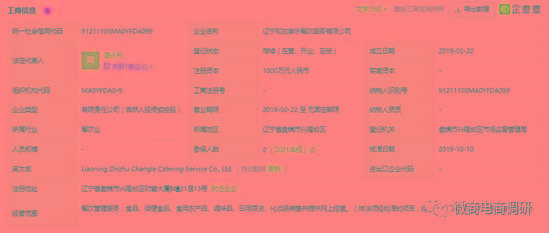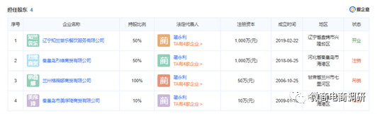 爱企查显示,蔺永利共与4家企业有关联。他除了是辽宁知竺尝乐餐饮服务有限公司董事长,还投资了秦皇岛烈维商贸有限公司,控股50%并担任法定代表人、执行董事兼总经理;投资了兰州格薇娜商贸有限公司,控股100%并担任法定代表人、执行董事兼总经理;投资了秦皇岛市美序琦商贸有限公司,持股10%并担任法定代表人、执行董事兼总经理。值得注意的是,4家企业中秦皇岛烈维商贸有限公司和秦皇岛市美序琦商贸有限公司已是注销状态,兰州格薇娜商贸有限公司也已被吊销。