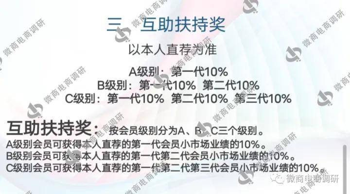 互相扶持奖:成为代理后,可获得所直推的代理商小市场业绩10%的互助扶持奖。普通代理商可获得所直推的第一代代理小市场业绩10%的扶持奖;中级代理商可获得所直推的第一代和第二代代理小市场业绩10%的扶持奖;高级代理商可获得所直推的第一代、第二代和第三代代理小市场业绩10%的扶持奖。