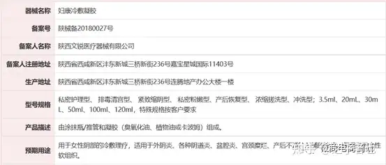 据产品外包装显示,该产品的产品备案号和产品技术要求编号为陕械备20180027号,生产备案编号为陕西食药监械生产备20170015号,生产企业为陕西文锐医疗器械有限公司,监制商为高安市鹏洋生物科技有限公司。据药智数据显示,该产品的预期用途为“用于女性阴部的冷敷理疗,适用于外阴炎、各种阴道炎、盆腔炎、宫颈糜烂、产后不适等的辅助治疗。仅用于闭合性软组织。”