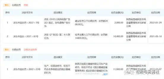 另外值得关注的是,据企查查显示,在最近两年的时间里,倩姿百态妇康冷敷凝胶的实际生产企业陕西文锐医疗器械有限公司相继因“违反《广告法》规定发布虚假广告行为”、“违反《广告法》第二十八条行为”、“生产、经营说明书、标签不符合规定的医疗器械的行为”屡遭陕西省西咸新区市场监督管理局沣东新城分局的行政处罚。