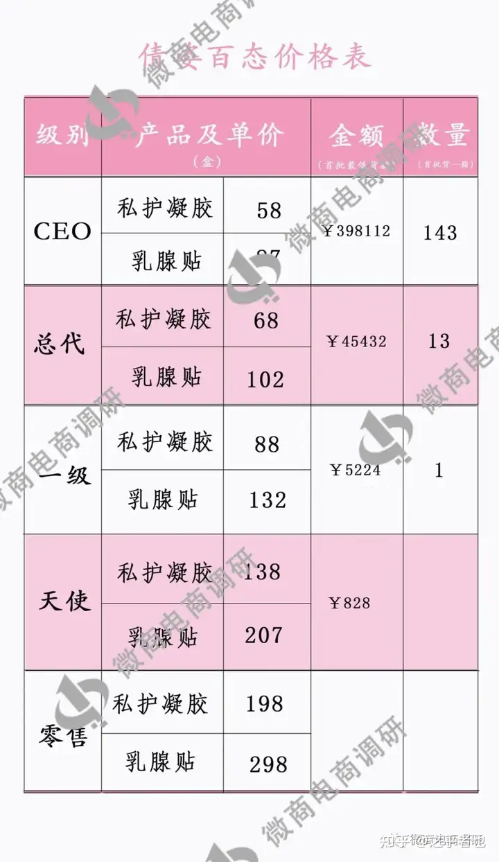 接下来,我们再来关注一下倩姿百态推行的奖金制度该如何解读。据推广人员阿强(化名)提供的资料显示,倩姿百态将代理商的级别主要分为四级,分别是天使、一级、总代和CEO。不同级别的拿货价自然不同,我们以零售价为198元/盒的凝胶为例,门槛为828元的天使代理的拿货价为138元,门槛为5224元(包含1000元押金)的一级代理的拿货价为88元,门槛为45432元(包含3000元押金)的总代的拿货价为68元,门槛为398112元的CEO的拿货价为58元。