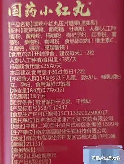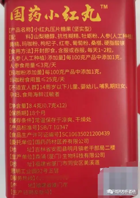 而事实上,该产品仅为普通食品,并非保健食品或药品。据产品外包装显示,该产品的全称为“小红丸压片糖果(坚实型)”,食品生产许可证编号为SC10635021200439,委托单位为国药药材医养有限公司,生产单位为森涌(厦门)生物科技有限公司。