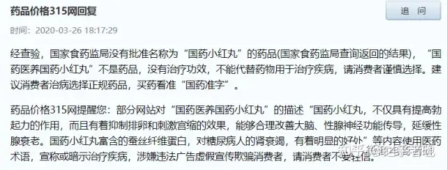 或许是这样的宣传太过吸引人,有消费者到药品价格315网上求证该产品的功效。对此,该网回复称:经查验,国家食药监局没有批准名称为“国药小红丸”的药品(国家食药监局查询返回的结果),“国药医养国药小红丸”不是药品,没有治疗功效,不能代替药物用于治疗疾病,请消费者谨慎选择。建议消费者治病选择正规药品,买药看准“国药准字”。部分网站对“国药医养国药小红丸”的描述“国药小红丸,不仅具有提高勃起力的作用,而且有着抑制排卵和刺激宫缩的效果,能够合理改善大脑、性腺神经功能传导,延缓性腺衰老。国药小红丸富含的蚕丝纤维蛋白,对糖尿病人的肾衰竭,有着明显的好处”等内容使用医药术语,宣称或暗示治疗疾病,涉嫌违法广告虚假宣传欺骗消费者,请消费者不要轻信。