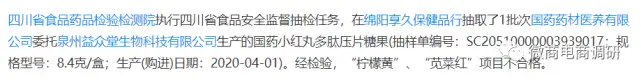 而早在2021年年初,《绵阳市市场监督管理局关于对6批次不合格产品核查处置情况的通告(2021年第1号)》的公示,就已然令不少人对国药药材医养有限公司委托其他企业生产的国药小红丸系列产品的质量产生了忧虑。《通告》显示,四川省食品药品检验检测院执行四川省食品安全监督抽检任务,在绵阳享久保健品行抽取了1批次国药药材医养有限公司委托泉州益众堂生物科技有限公司生产的国药小红丸多肽压片糖果(抽样单编号:SC20510000003939017;规格型号:8.4克/盒;生产(购进)日期:2020-04-01)。经检验,“柠檬黄”、“苋菜红”项目不合格。据悉,“柠檬黄”和“苋菜红”都是人工合成色素。