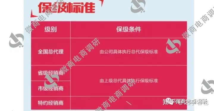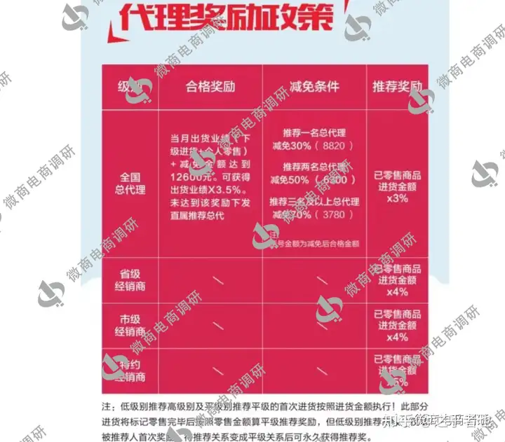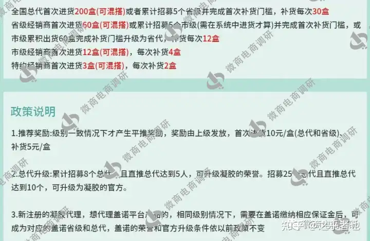 关于盖诺微商推行的模式,据代理商阿红(化名)透露,盖诺微商也是分特约、市级、省级、总代等级别的,特约门槛是3套产品,市级门槛是990元,省级门槛是5400元+1600元保证金,总代如前文所述,门槛是2.1万元+5000元保证金。具体政策如下:
