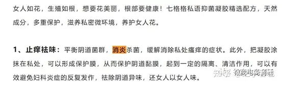 在由湖南盖诺生物科技有限公司认证的官方公众号“格格私密花园”的介绍下,七格格私语花蕊抑菌凝胶被包装出了消炎功效,在题为《七格格私语花蕊抑菌凝胶百问百答》的文章中,就存在着这样的描述:“七格格凝胶有很强的消炎抑菌、清除毒素和垃圾的效果……”