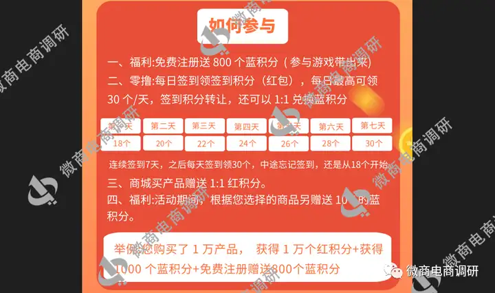 商城买产品赠送90%红积分,活动期间再赠送10%蓝积分,比如您购买了1万元的产品,就能获得9000个红积分,同时还能获得1000个蓝积分。