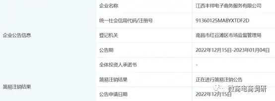 据知情人透露,丰润腾祥的经营主体并非江西丰腾电子商务有限公司,而是江西丰祥电子商务服务有限公司,该公司成立于2022年9月20日,法定代表人黄道辉,股东有黄道辉(大股东)、安燕林,不过当时间来到2022年12月中旬时,该公司就已处于“正在进行简易注销公告”的经营状态了。