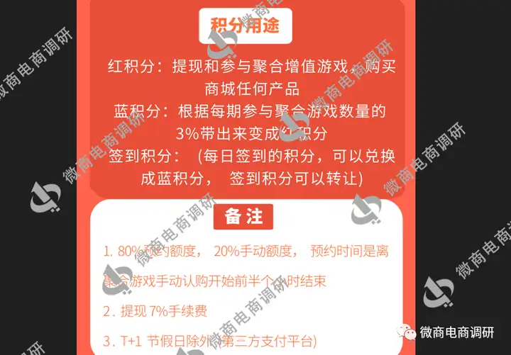 2.蓝积分:根据每期参与聚合游戏数量的3%变红积分、红积分兑现使用10%蓝积分(不能互转)